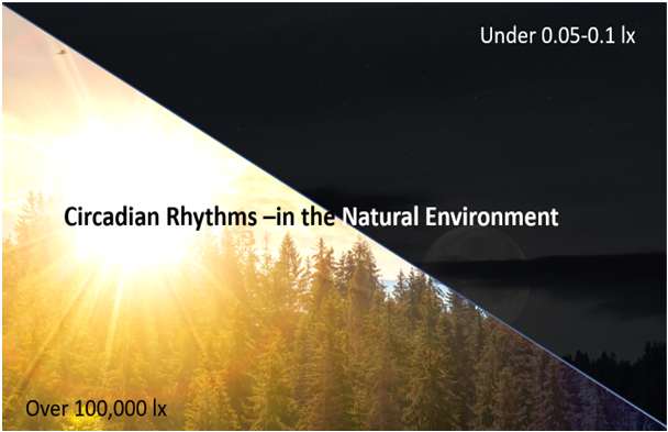 Humans, like all life on earth, have adapted to the 24-hour day-night cycle …over 100,000 lux during the day and .05-0.1 lux at night.
