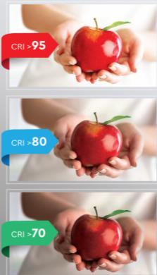 As the CRI increases, more shades of colour become apparent to the human eye. Like the apples in the adjacent images, details, contrast, and colours are enhanced.